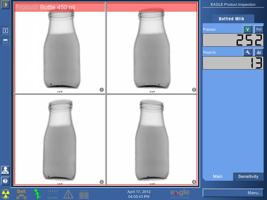 El QuadView de Eagle utiliza una cobertura de detección de cuatro vistas que proporciona una inspección completa de los alimentos en contenedores de hasta 304 mm (12″) de altura y 152 mm (6″) de diámetro, eliminando los puntos ciegos que suelen producirse en el fondo de los contenedores. Con una impresionante capacidad de detección de contaminación a tasas de línea superiores a 1000 PPM, puede ayudar a los fabricantes a aumentar la productividad realizando simultáneamente las siguientes comprobaciones de integridad del producto en línea: