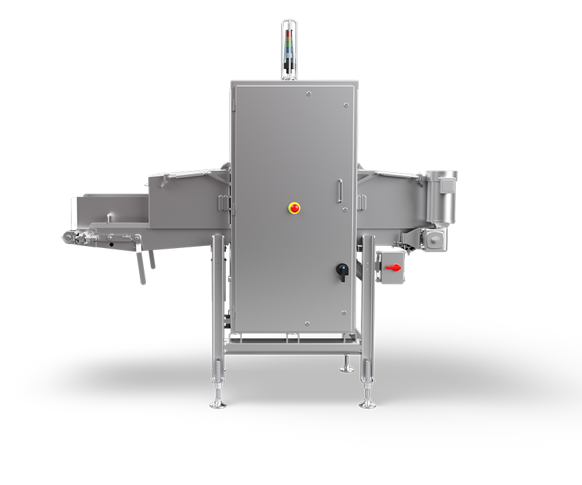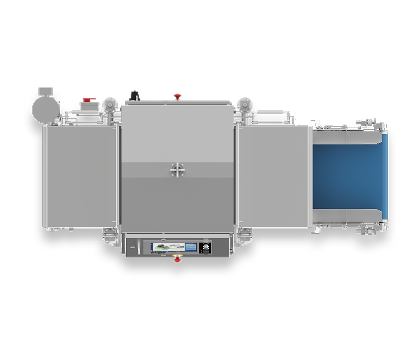 Cinta de 598 mm (23,5″) de ancho por 2295 mm (90,3″) de largo, incluida la sección de transferencia de alimentación de 520 mm (20,4″); cinta azul apta para el transporte de alimentos.